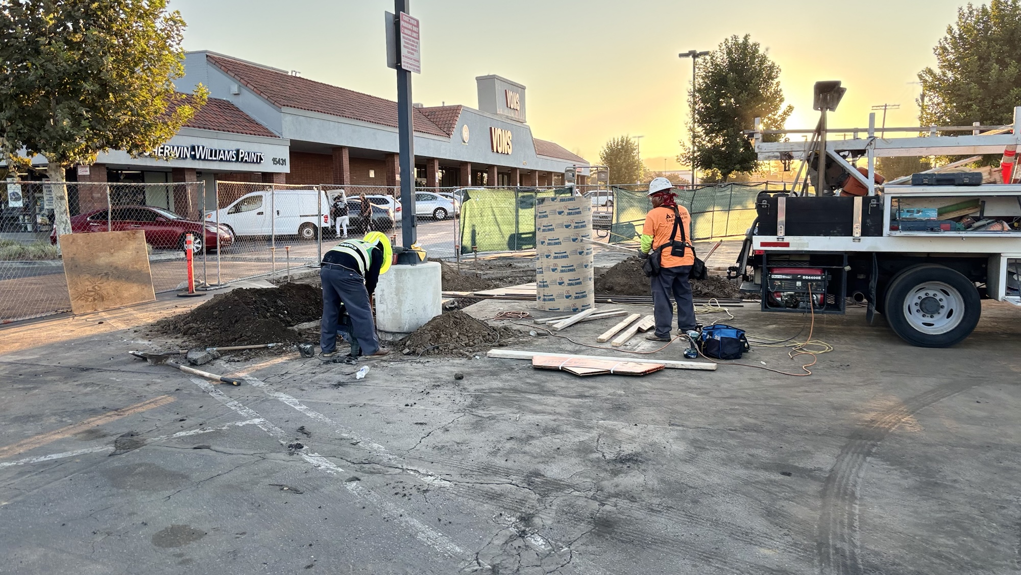 Our team is currently in phase one, kicking off site work with a demo of the existing planters and city sidewalk. We have since then relocated a light pole while building new planters and a drive entrance. The full scope of phase one also includes a re-slurry and re-strip of the existing asphalt.
